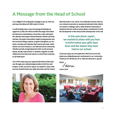 Jeanne and I worked with Brookwood School to create a clean and modern annual report, a colorful yearly calendar of student artwork, and an annual magazine for the Brookwood community. I enjoyed working for a K-8 school, with all of the playful children and celebratory events sprinkled throughout the material.