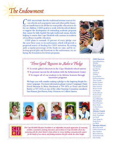 In 2001, the Cape Elizabeth Education Foundation was created to fund initiatives that fall outside the regular school budget. I designed the introductory flier, and was involved for fifteen years in various capacities—as a strategist, designer, and board member. I designed annual reports, a case statement, event promotions, and spearheaded a new website.