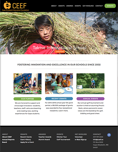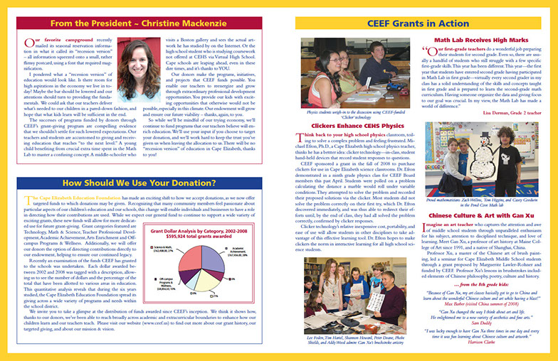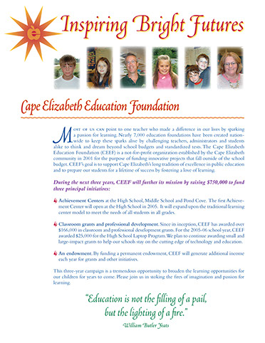 In 2001, the Cape Elizabeth Education Foundation was created to fund initiatives that fall outside the regular school budget. I designed the introductory flier, and was involved for fifteen years in various capacities—as a strategist, designer, and board member. I designed annual reports, a case statement, event promotions, and spearheaded a new website.