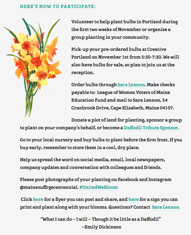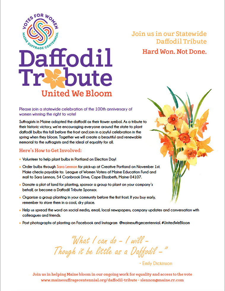 The Daffodil Tribute commemorates the 100th Anniversary of the Suffrage Centennial. Citizens across Maine planted thousands of yellow daffodils (the Suffrage symbol) to create a living, renewable tribute to brave women and the goal of equality for all. As project manager, I oversaw the communication, outreach and organization of plantings.