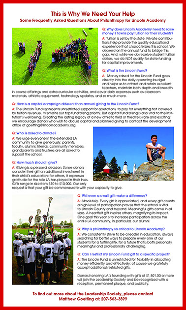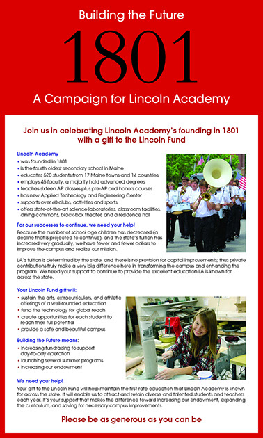 Matthew Goetting arrived at Lincoln Academy in 2014 eager to rejeuvenate the outreach and fundraising efforts of this growing public-private Academy in New Castle, Maine. Together we wrote and designed the first few pieces he used to build his vision.