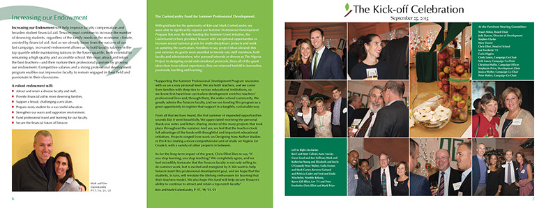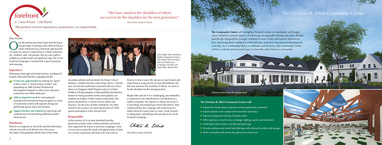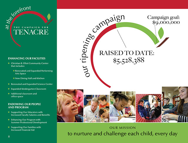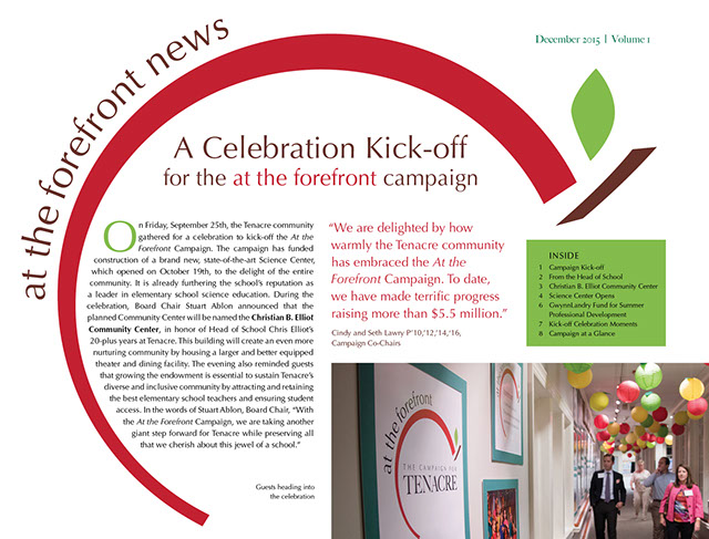 When the Tenacre School launched a 9M dollar capital campaign, they brought in Jeanne to brand the campaign. When the time came to educate and involve the Tenacre community, they hired me to help write the copy for a series of newsletters showcasing ongoing progress and remaining goals.